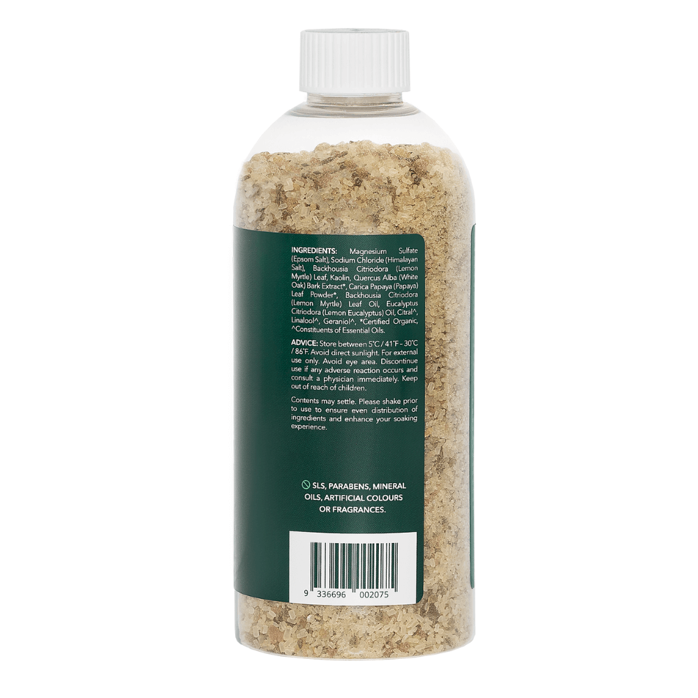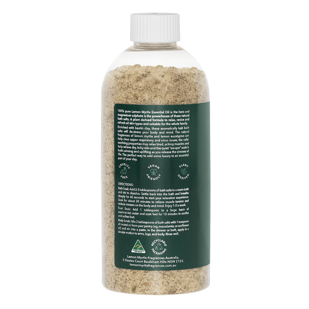 100% pure Lemon Myrtle Essential Oil is the hero and magnesium sulphate is the powerhouse of these natural bath salts. A plant derived formula to relax, revive and refresh all skin types and suitable for the whole family.